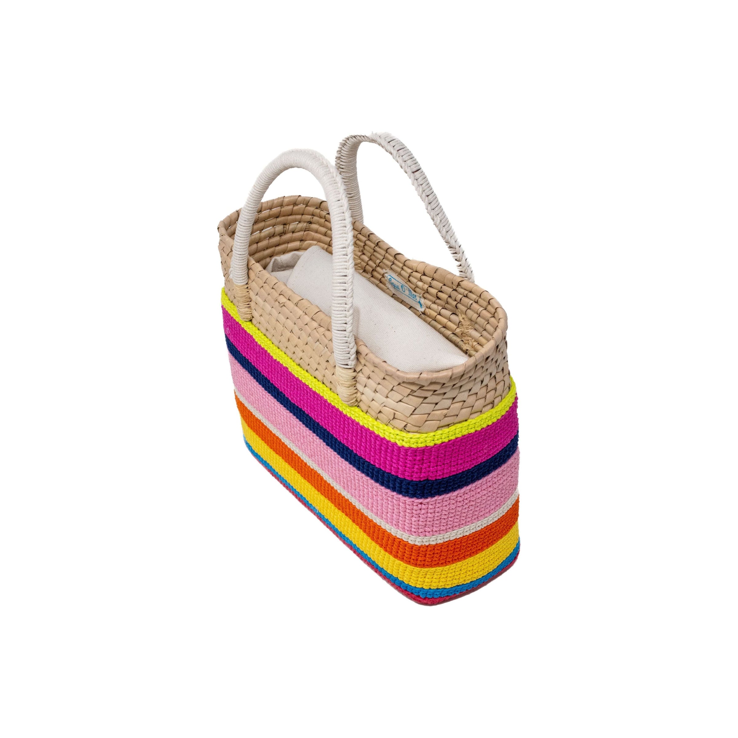 Materials: 100% palm, 100% cotton Yarn, Wax cord, Natural Raffia. 100% Cotton liner