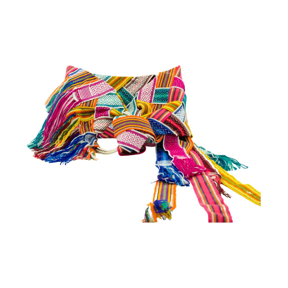 Unique, versatile woman belt inspired in Andean textile traditions crafted from neatly braided colorful thin “fajas.” This fringed belt is a fun accessory, unlike other belts anyone might have.