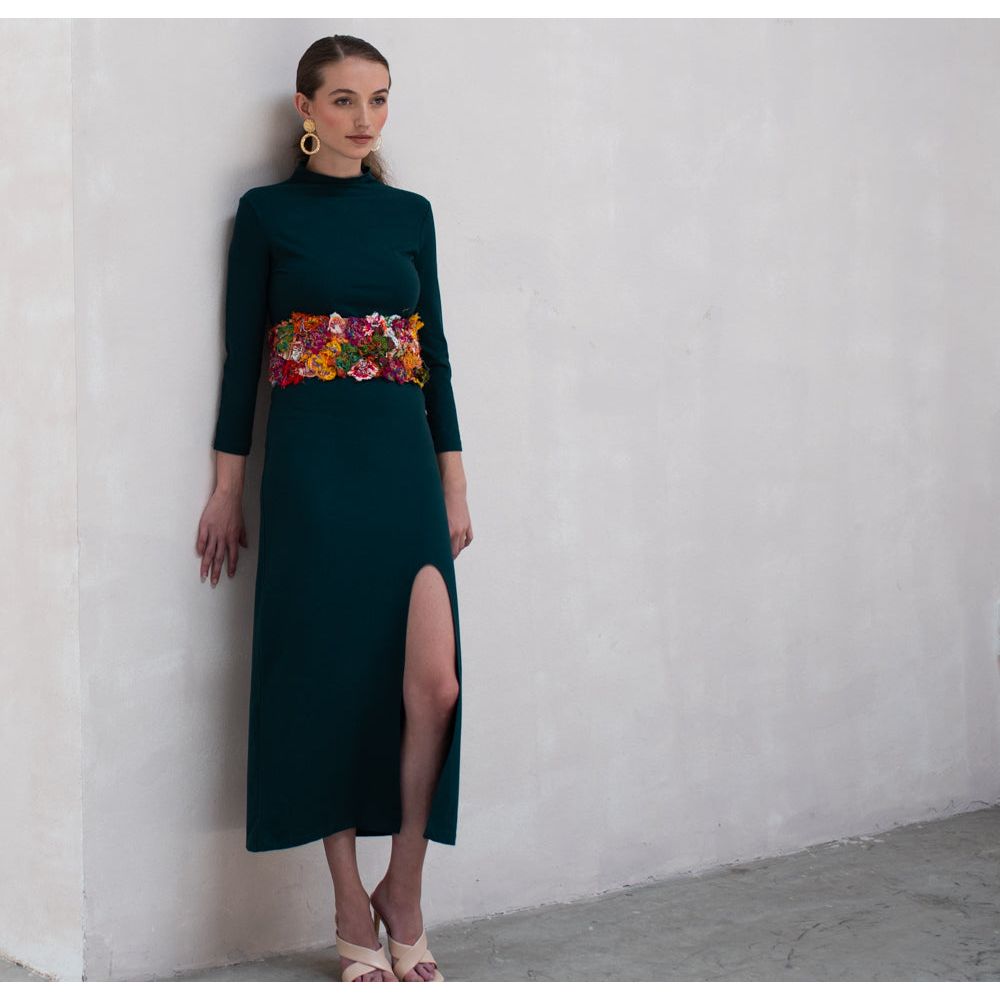 Sutu, which means remainder In the Shuar Language. It is a one-of-a-kind belt made of the remains of the fajas. It is an accessory that you can wear as a belt, or if you want to be bold, you can wear it as a top.
